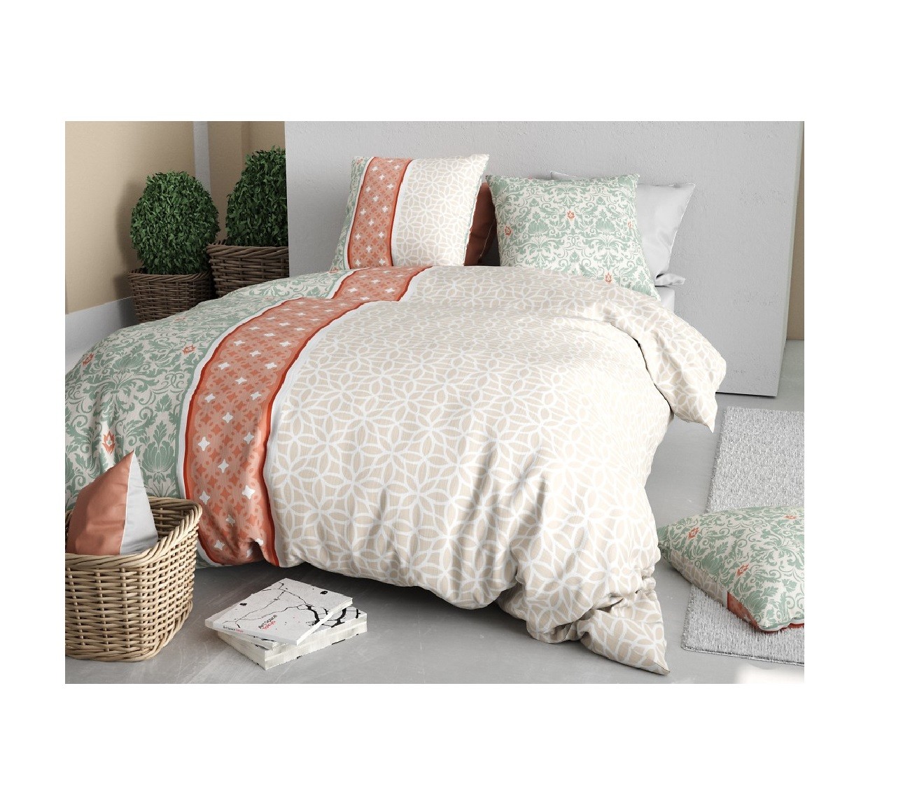 Apportez douceur et élégance à votre chambre avec cette parure de lit aux motifs raffinés : arabesques florales vert tendre, motifs graphiques beiges et touches terracotta.