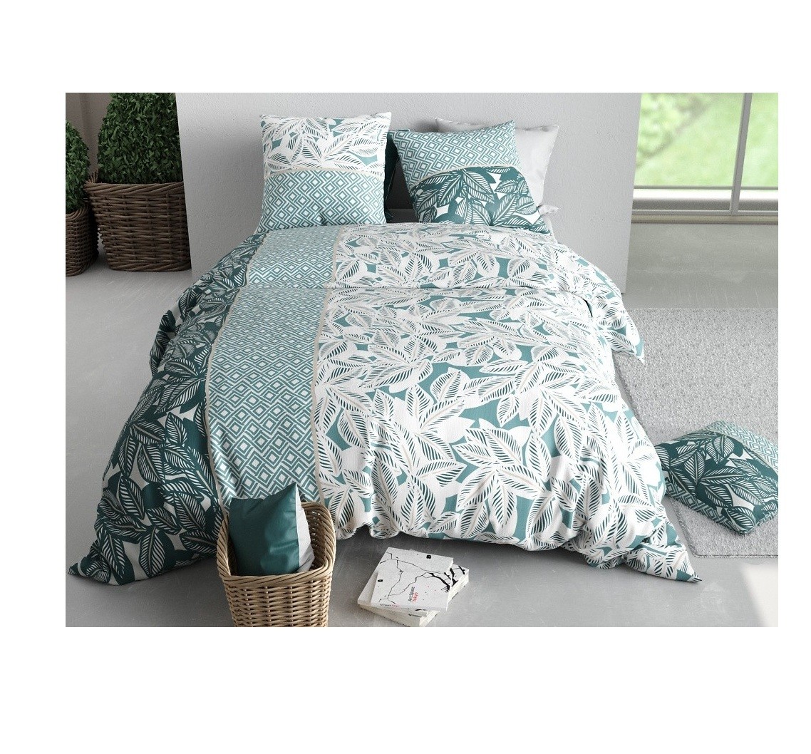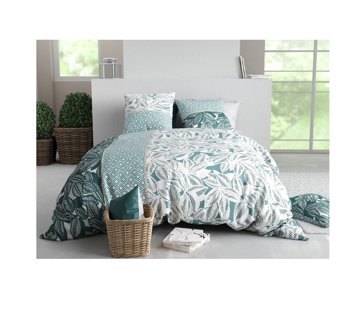 Apportez une touche de fraîcheur et de nature à votre chambre avec cette parure de lit au motif feuillage vert sur fond blanc, combiné à un jeu de losanges graphiques.