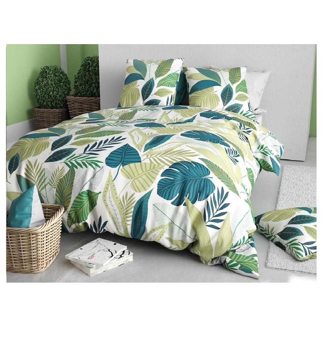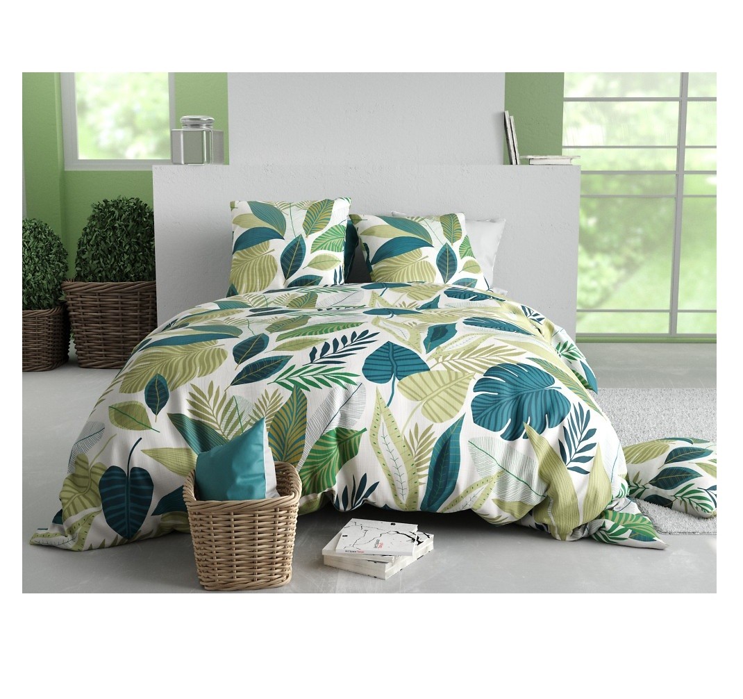 Apportez une touche de nature et de fraîcheur à votre chambre avec cette parure de lit aux motifs feuillage exotiques dans des tons verts et bleus sur fond blanc lumineux.